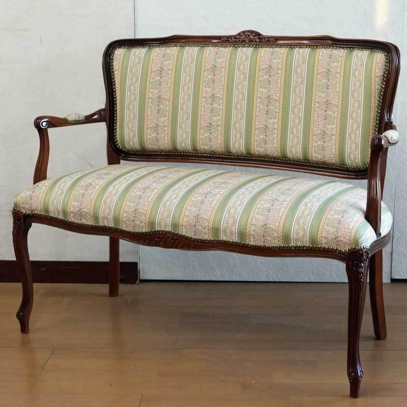 - ソファ・ソファベッド > 2人掛け・3人掛けソファ > 【ほぼ送料代】2人掛けソファ グリーン ブラウン アンティーク風 イタリア 二人がけソファー グリーン ストライプ ラブソファ 2P 2人