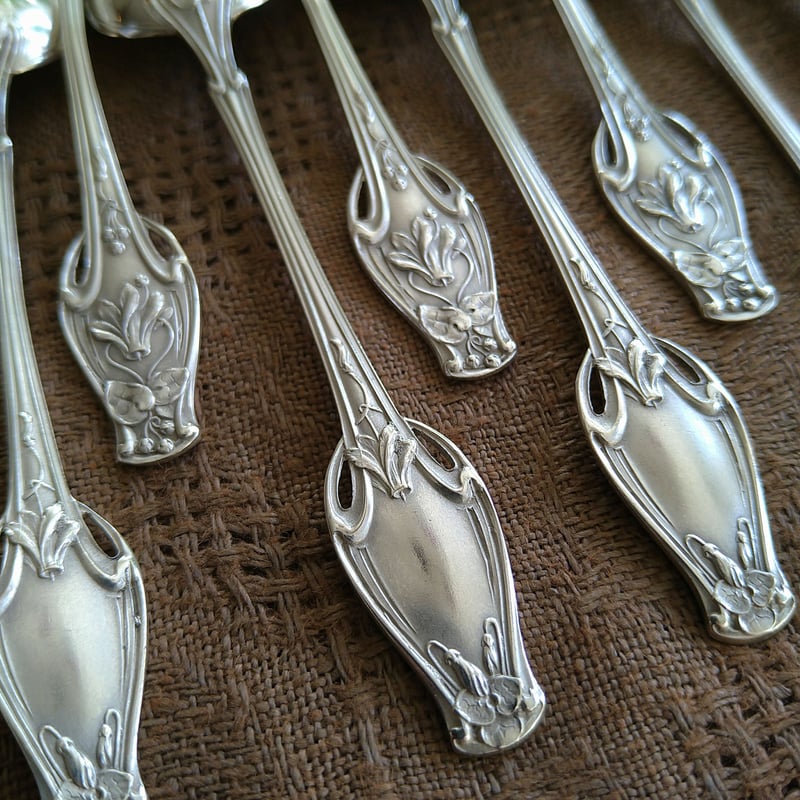 - 美術品・アンティーク・コレクション > 工芸品 > 極上品 フランス アールヌーボー期 純銀無垢 スプーン&フォークセット ① 1884~1910年HenriSoufflotフランス・パリ、シクラメンのアール