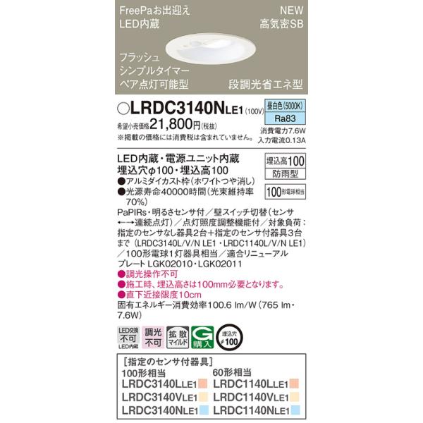 - ライト・照明 > シーリングライト・天井照明 > Panasonic LRDC1200LLE1 ダウンライト 法人様限定】パナソニック LRDC3140N LE1 LEDダウンライト 屋外用 埋込